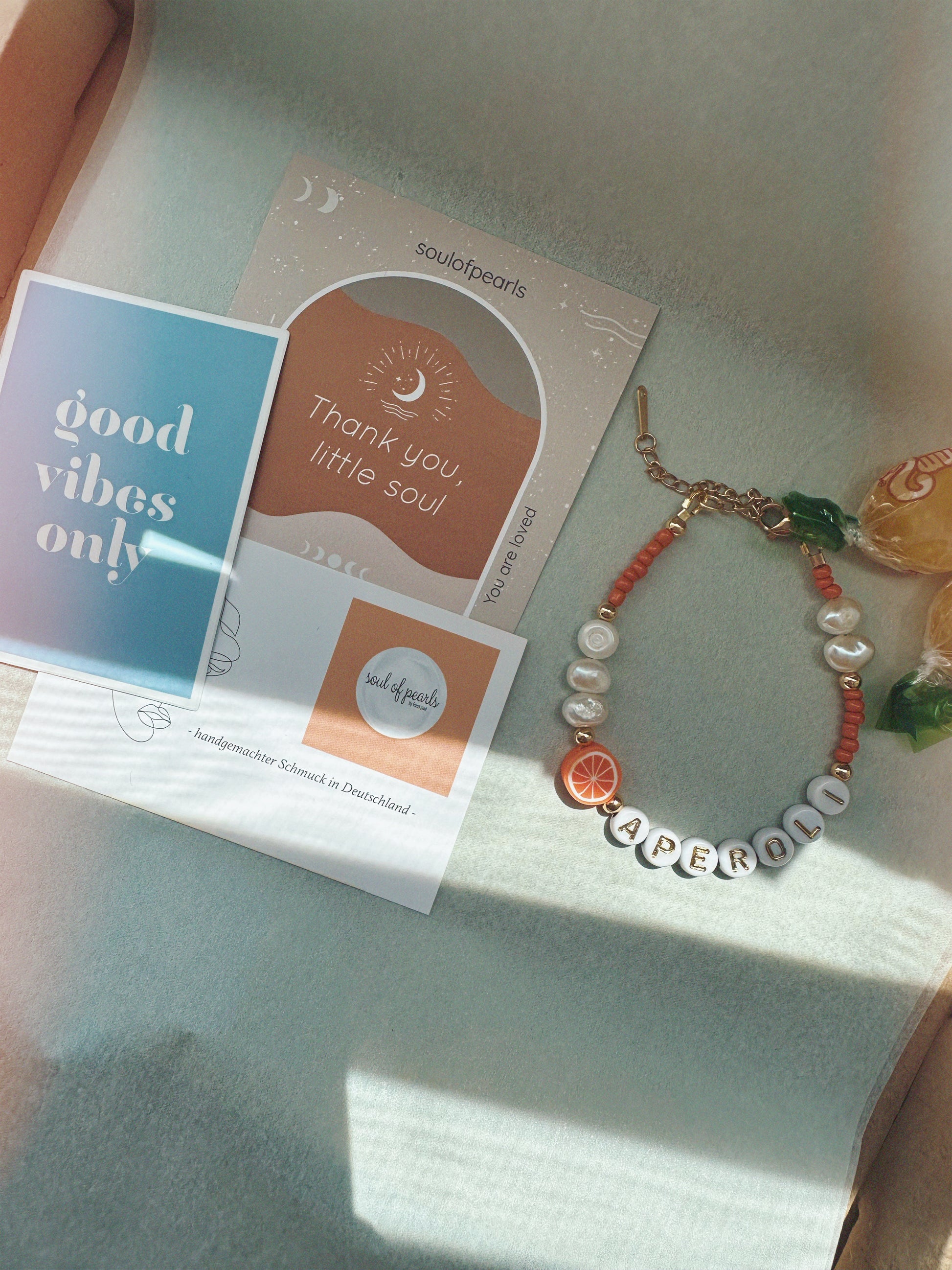 Unser Aperoli Armband widerspiegelt, die fröhliche und lebhafte Atmosphäre des Aperol Spritz Getränks. Das Armband ist in den charakteristischen Farben des Getränks gestaltet und verleiht jedem Outfit eine sommerliche Note.