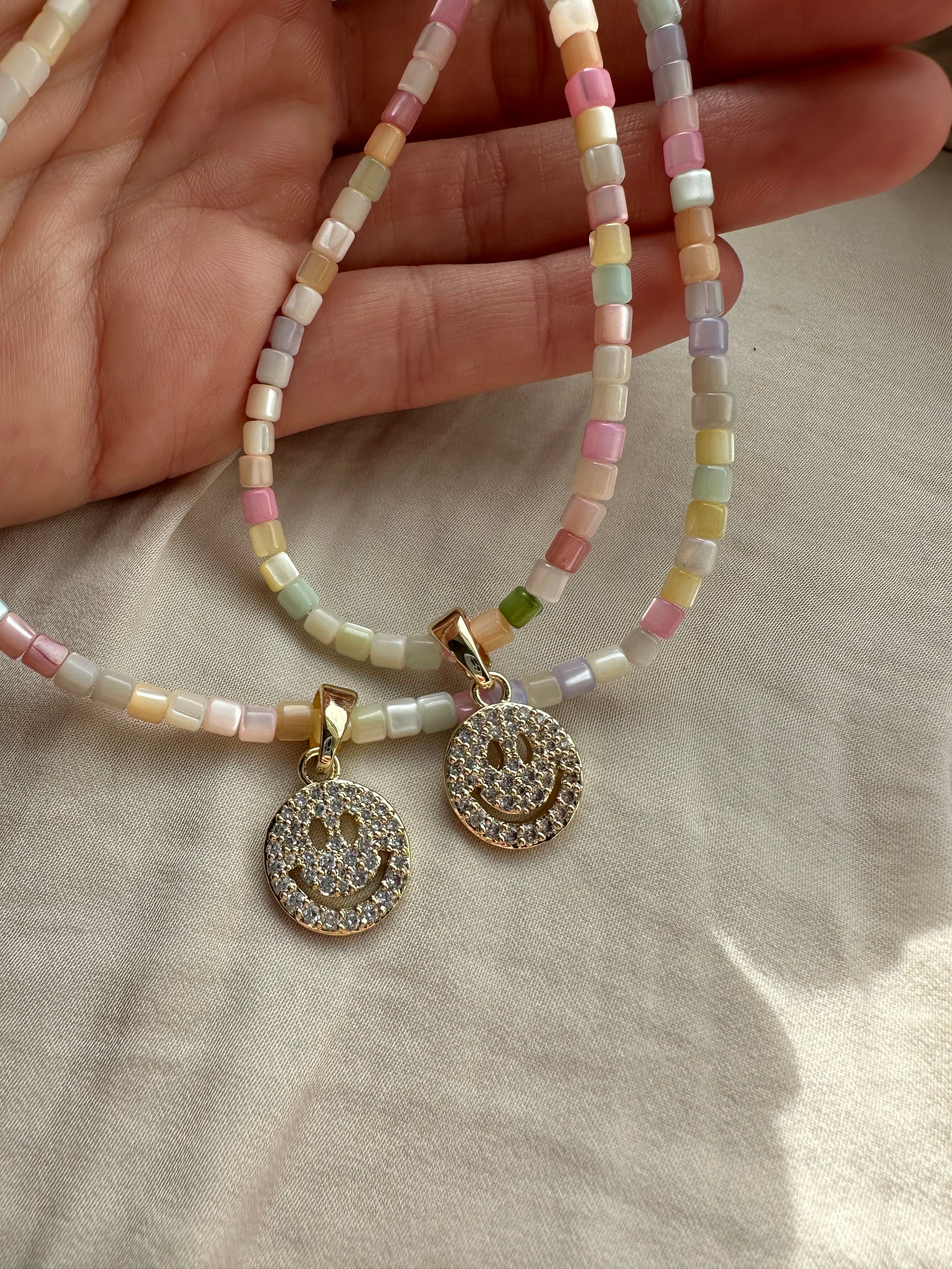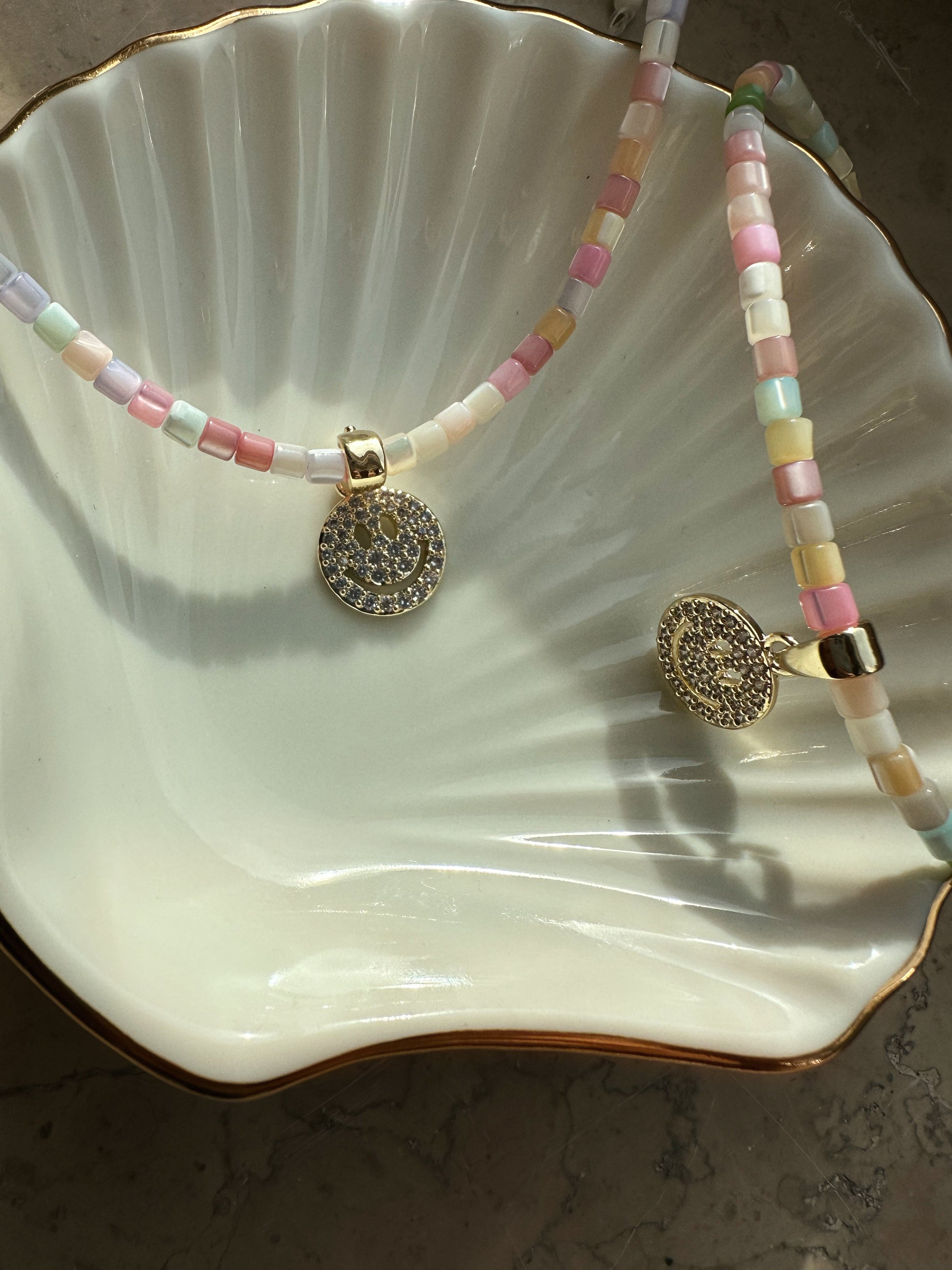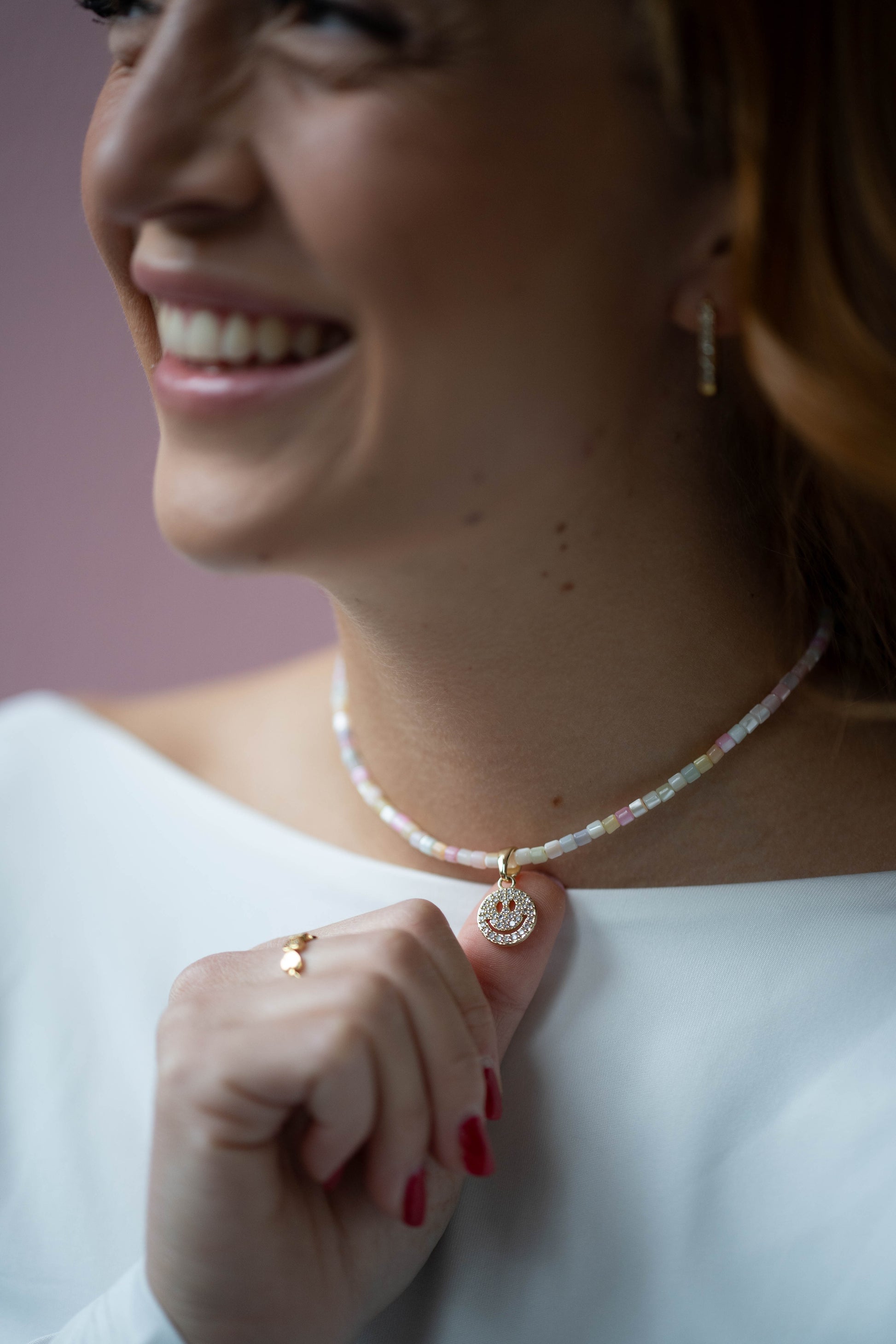 Die Happy Halskette zaubert dir garantiert jeden Tag ein Lächeln ins Gesicht. Sie besteht aus bunten Muschelperlen, kombiniert mit einem vergoldeten Smileyanhänger. Der Anhänger ist mit Zirkoniasteinen besetzt.