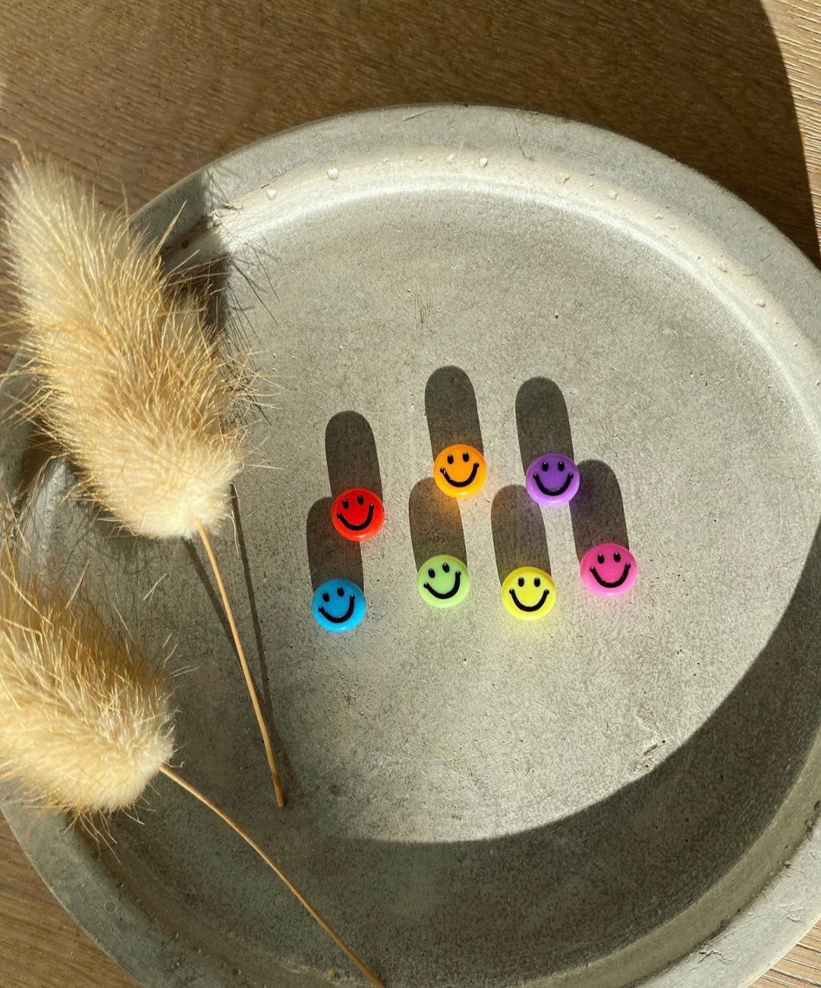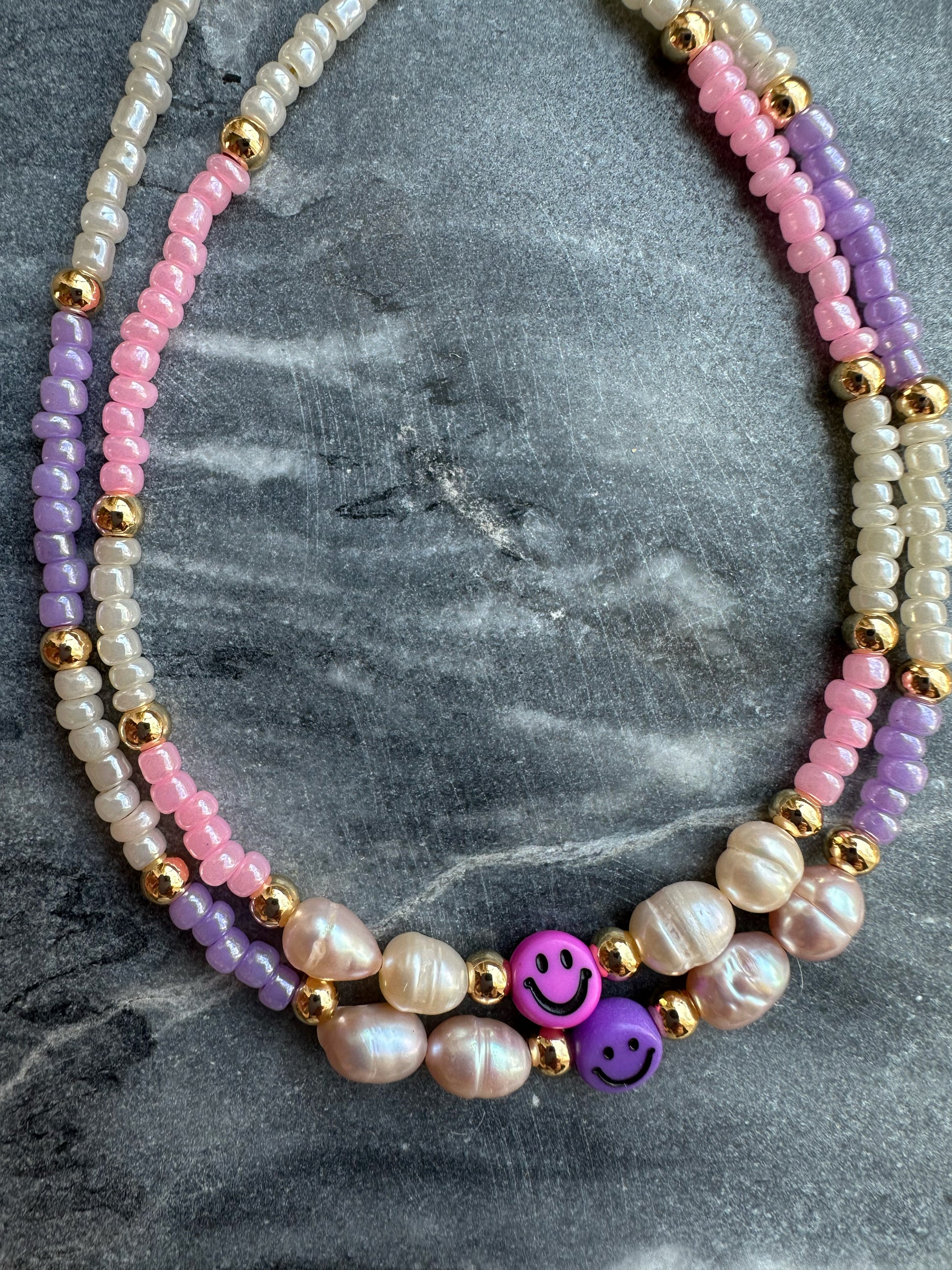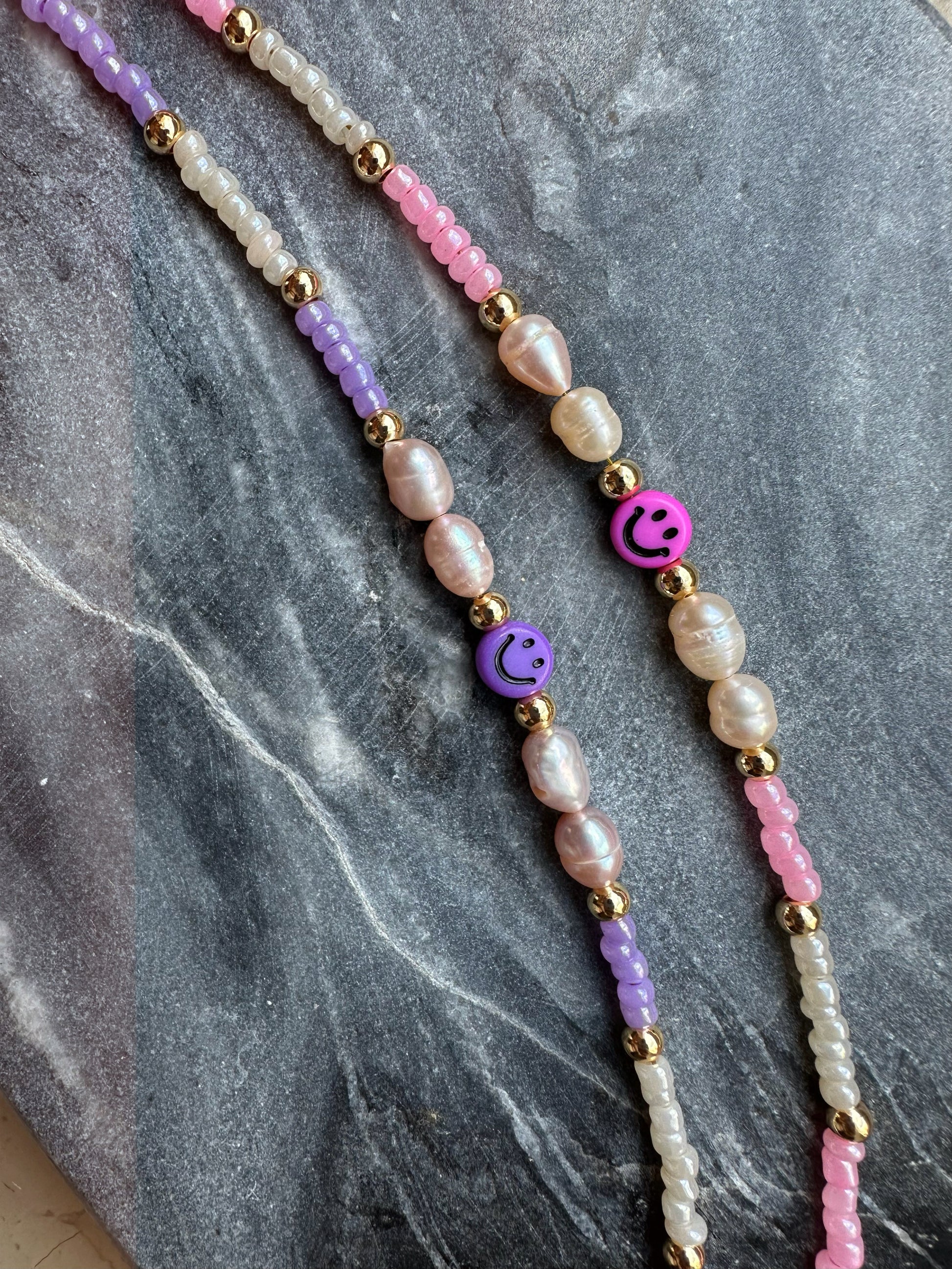 Wähle deinen Smiley aus und erhalte deine Kombination aus Pastellfarben passend zum Smiley, jedes Armband hat auch beige Perlen integriert.